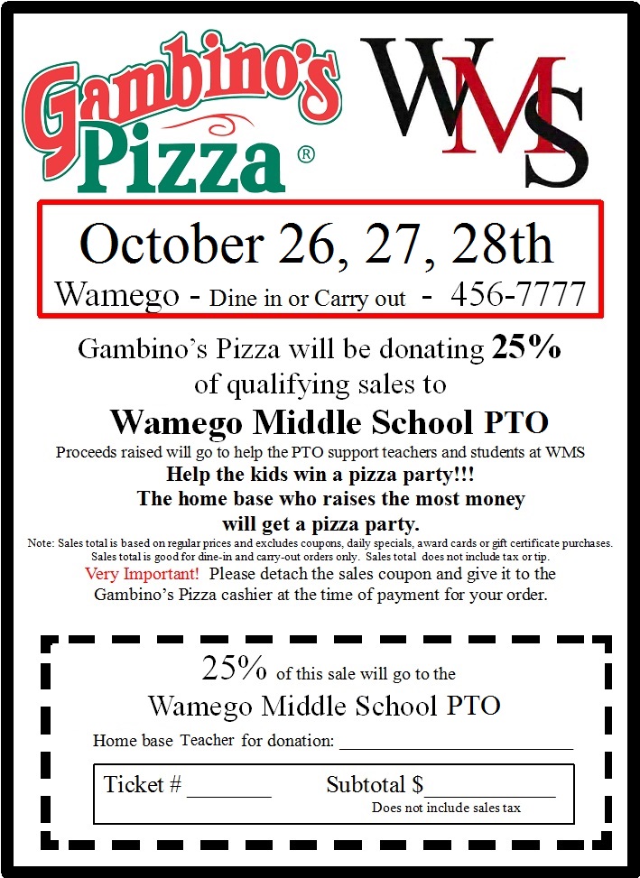 - PTO Gambino's Fundraiser is October 26-28th. 25% of of qualifying sales will be donated to WMS! You can find the flyer below!